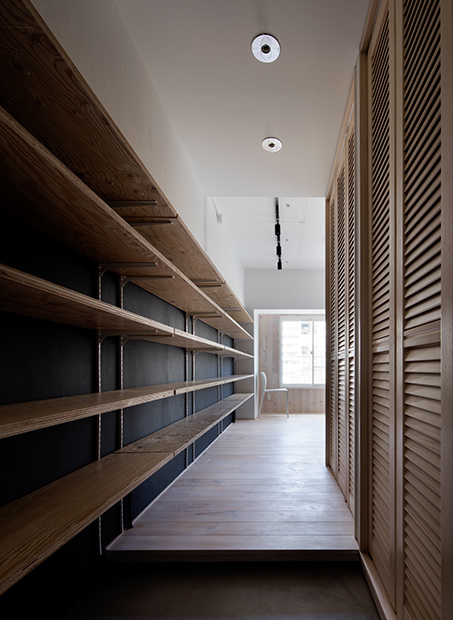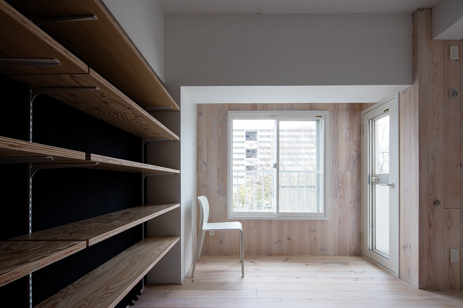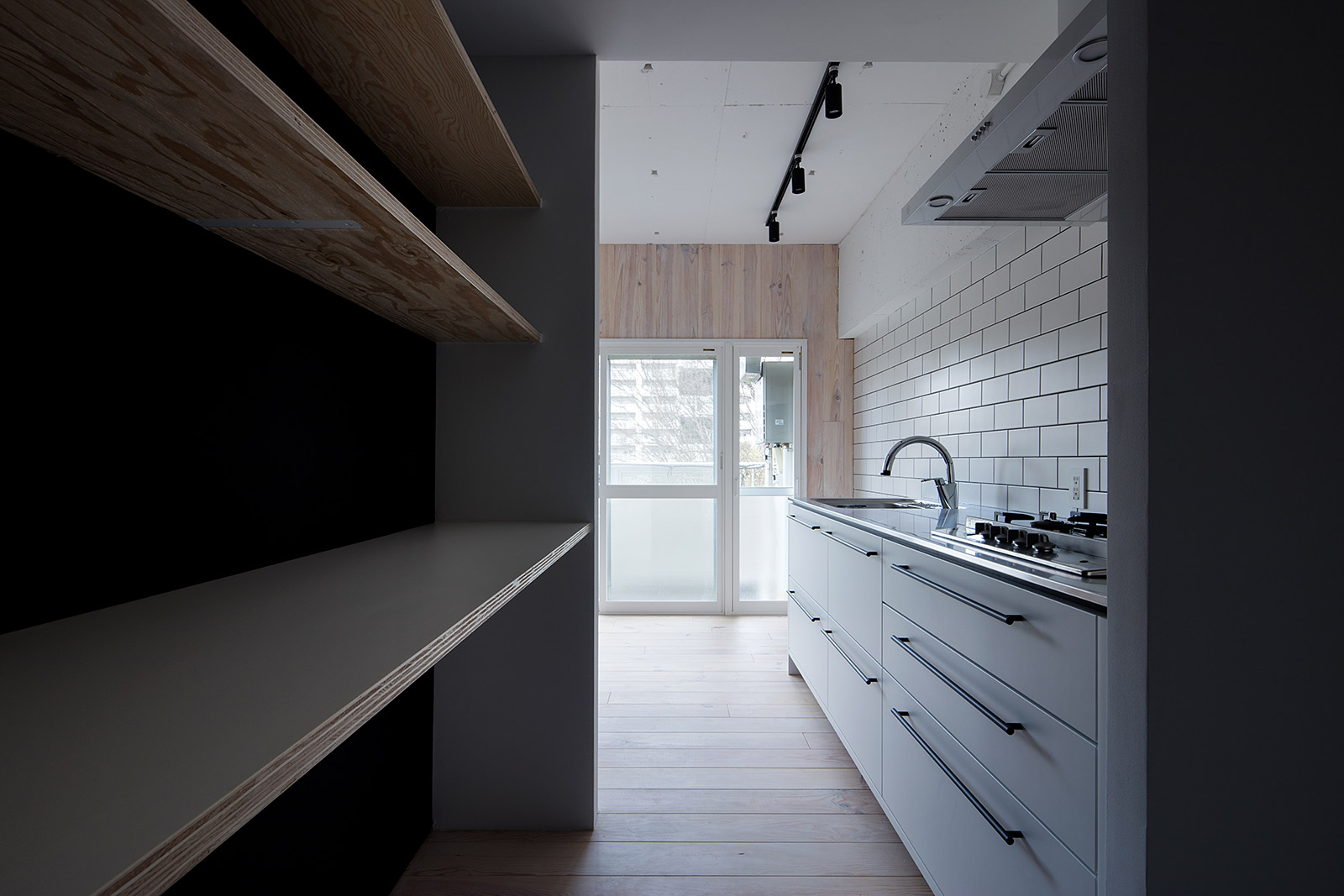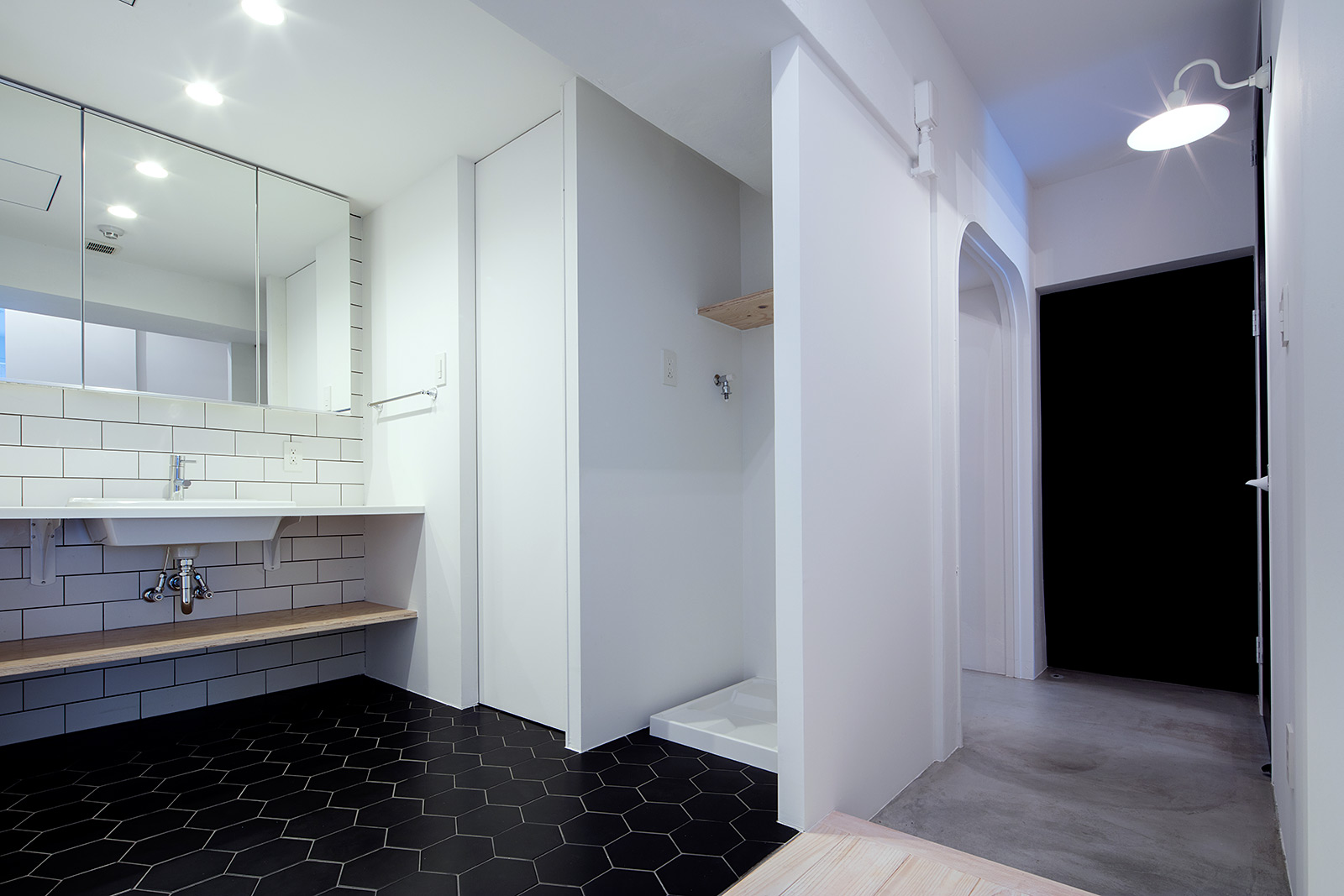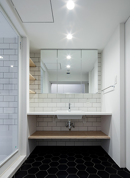 平和大通りの緑を取り込むようにLDKや寝室を配置。その寝室を中心にLDK、洗面、WICへと動線を計画。玄関から続く土間を長く、リビング入り口と洗面入り口まで伸ばし、自転車やアウトドアグッズなども置けるような広いスペースを確保した。当社のオリジナルデザインで製作したキッチン、洗面台と浴室はハーフユニットバスでタイル貼りを採用。可動棚を多く設置したWICなど、収納量は多くとりながら、ひとり・ふたりで暮らすためのゆったりとした空間構成とした。