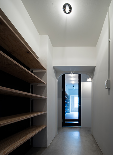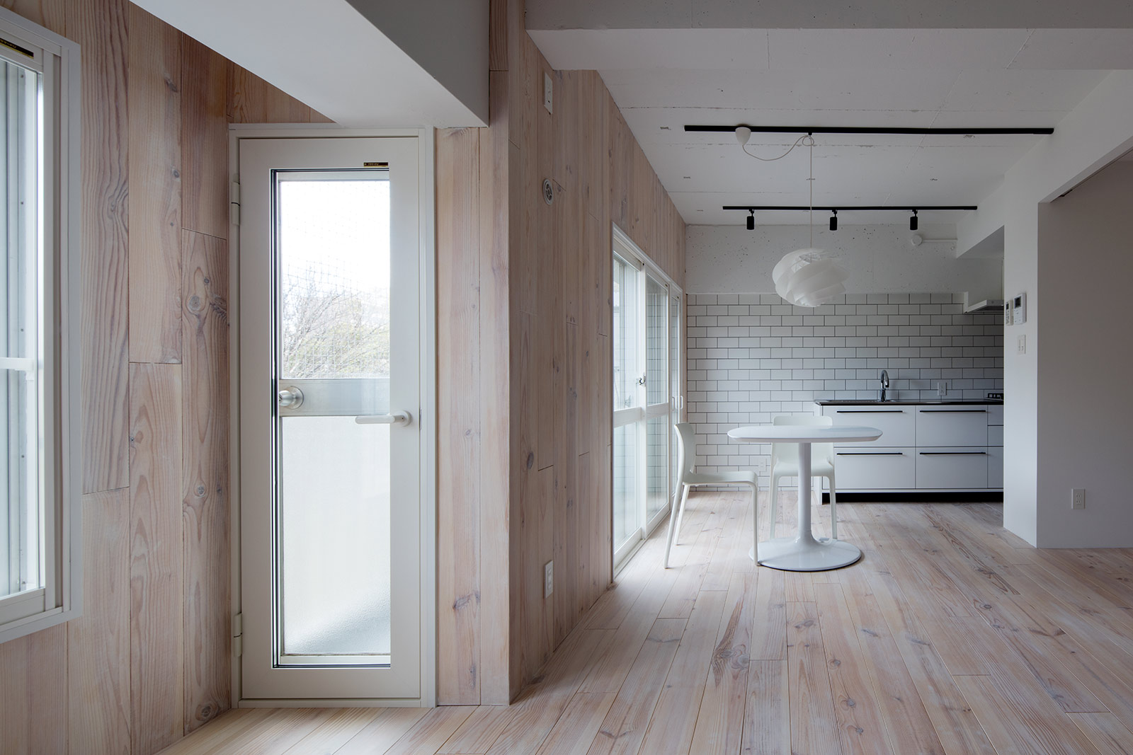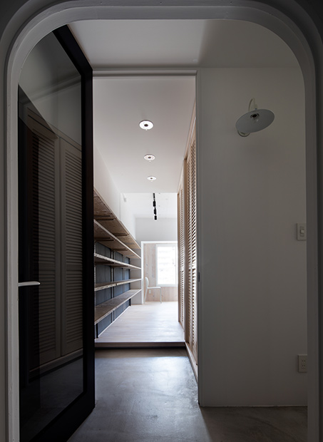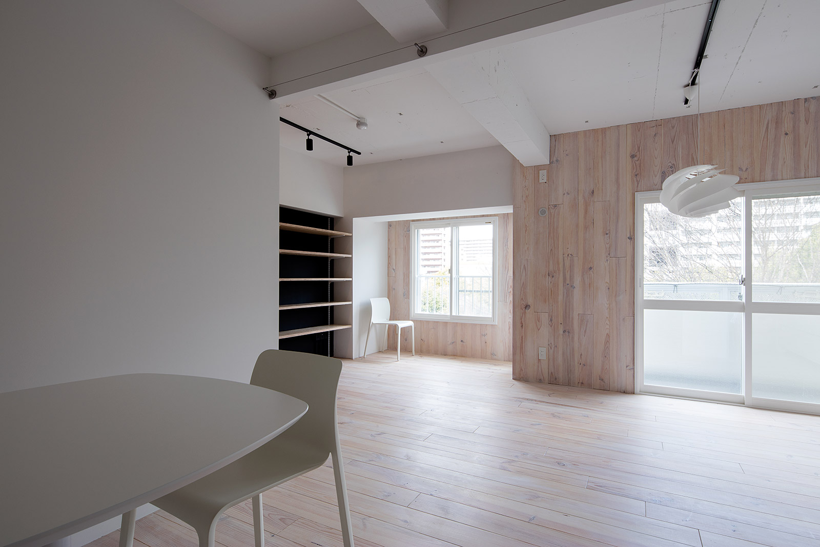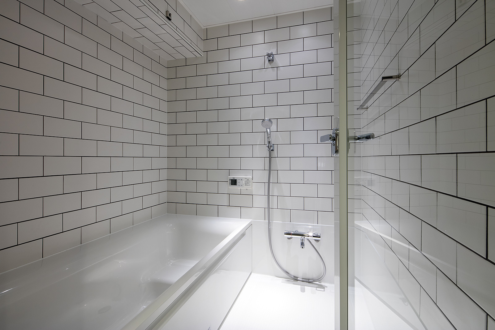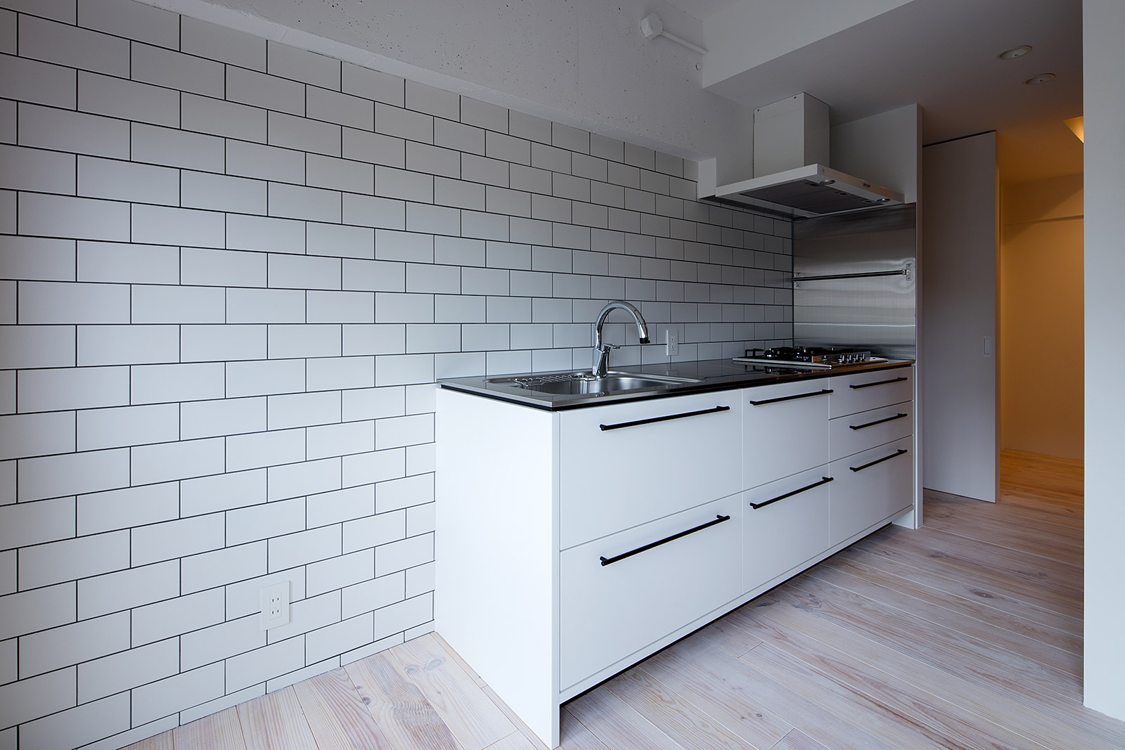 平和大通りの緑を取り込むようにLDKや寝室を配置。その寝室を中心にLDK、洗面、WICへと動線を計画。玄関から続く土間を長く、リビング入り口と洗面入り口まで伸ばし、自転車やアウトドアグッズなども置けるような広いスペースを確保した。当社のオリジナルデザインで製作したキッチン、洗面台と浴室はハーフユニットバスでタイル貼りを採用。可動棚を多く設置したWICなど、収納量は多くとりながら、ひとり・ふたりで暮らすためのゆったりとした空間構成とした。