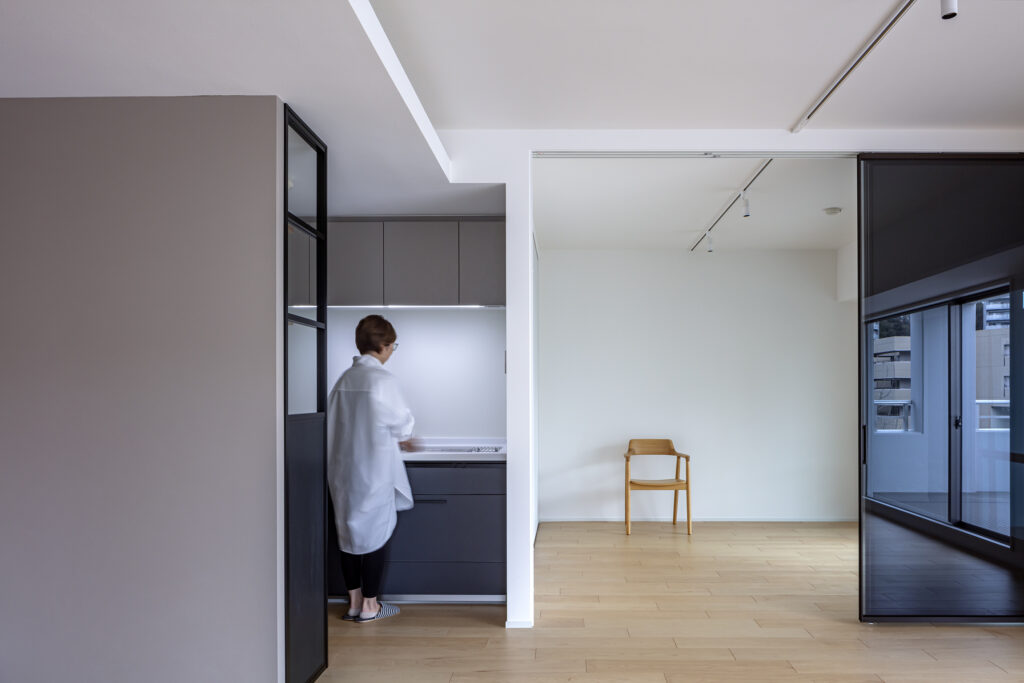 建具の扉と壁のウォールパネルの仕上げを同一のものに。