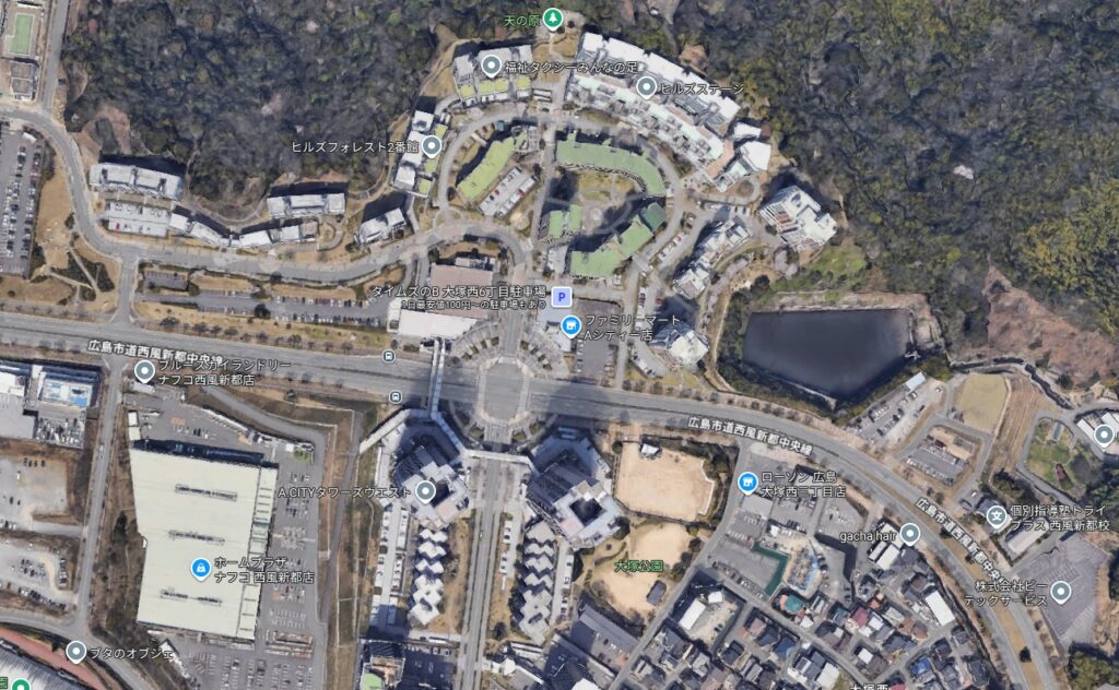 Aシティは1990年代に整備された大規模住宅エリアで、 「ヒルズパレット」「ヒルズフォレスト」「ヒルズアリーナ」など複数のマンション群から構成されています。