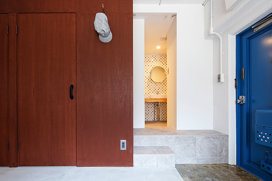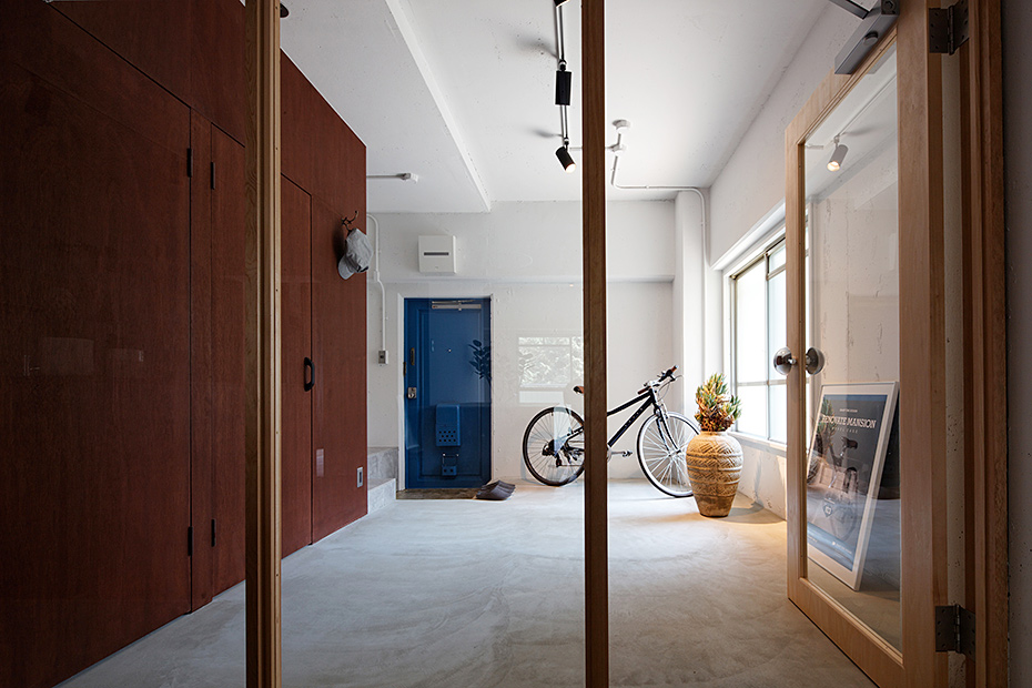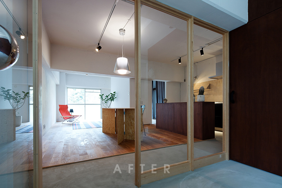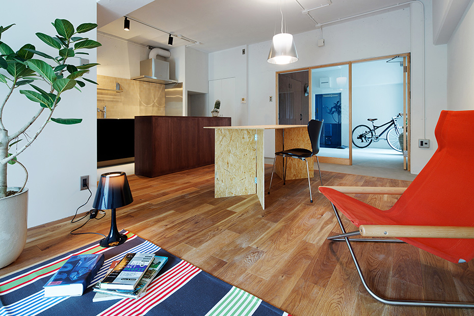 一般的な間取りでいえば、2LDKや3DKクラスの居住面積約56m2。今回のリノベーションは、その一室をスケルトンにするところから始まりました。エントランスには、土間のようなスペースをつくり、全体に程よくオープンで広がりのある空間にするのが今回のプラン。アウトドア好きでアクティブな30代。そんな特化したニーズを想定し、自由なレイアウトを楽しめる洗練されたカジュアルな空間を目指しました。