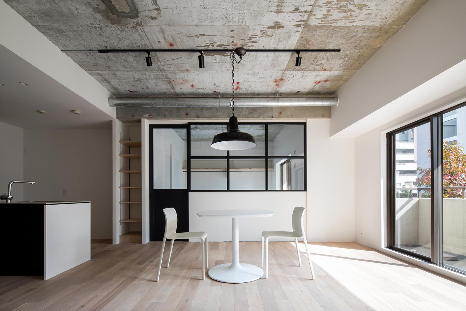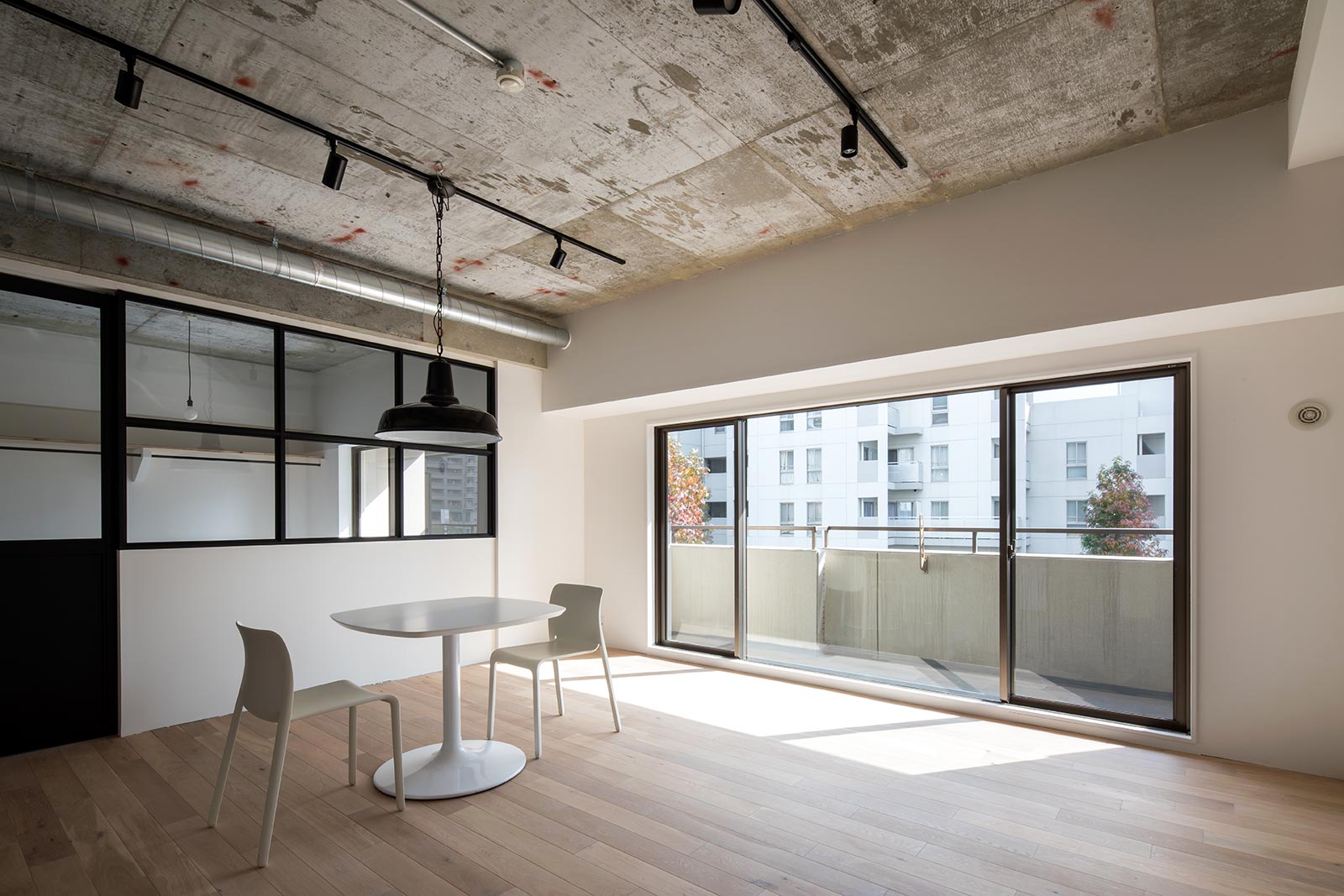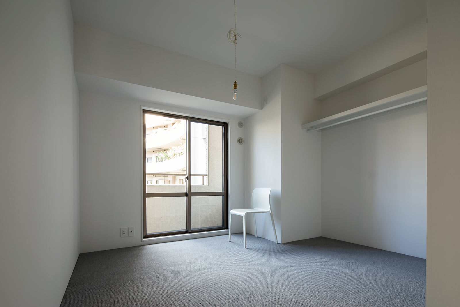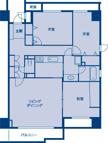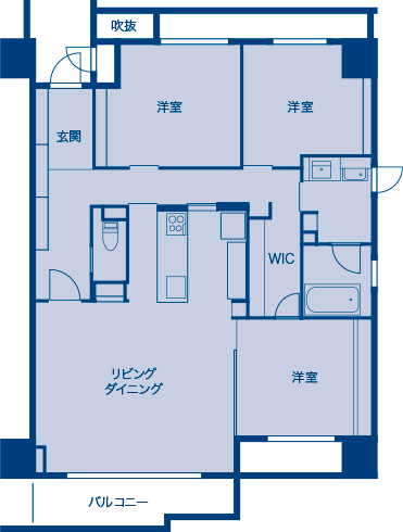 リノベーションプランは両面バルコニーを活かし、広めの個室を確保しながら、回遊導線を取り入れてオープンな空間づくりで圧迫感を無くして、より広い印象に。また要望の多い収納に便利なWICや住居、リビングの中央にキッチンを設けて、住む人の家族構成や暮らしぶりに合わせて、自由なレイアウトができるように計画しています。朝陽が明るい東向きバルコニーにリビング、集合住宅の中庭がある対面の西側バルコニーが各個室となります。